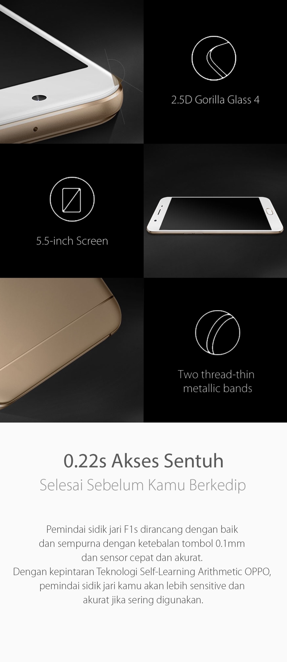 Pemindai sidik jari F1s dirancang dengan baik dan sempurna dengan ketebalan tombol 0.1mm dan sensor cepat dan akurat. Dengan kepintaran Teknologi Self-Learning Arithmetic OPPO, pemindai sidik jari kamu akan lebih sensitive dan akurat jika sering digunakan.
