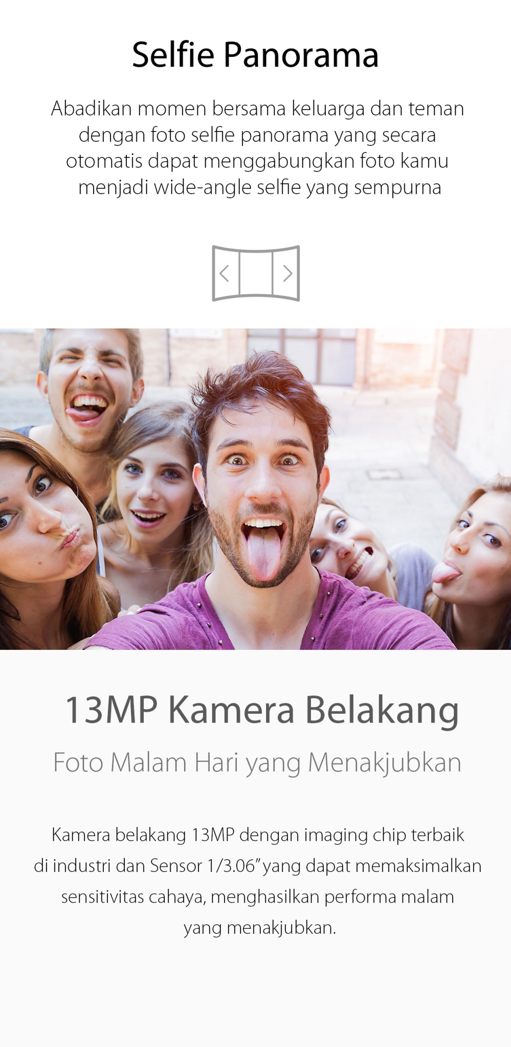 Abadikan momen bersama keluarga dan teman dengan foto selfie panorama yang secara otomatis dapat mengabungkan foto kamu menjadi wide-angle selfie yang sempurna.