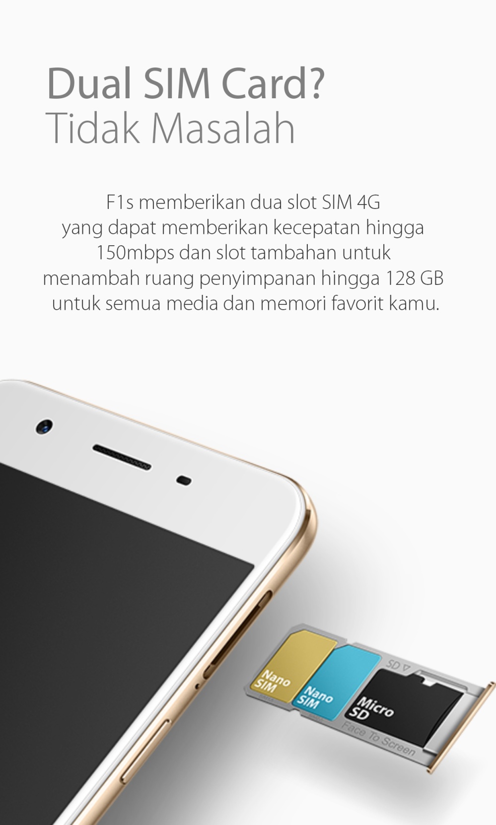 F1s memberikan dua slot SIM 4G yang dapat memberikan kecepatan hingga 150mbps dan slot tambahan untuk menambah ruang penyimpanan hingga 128 GB untuk semua media dan memori favorit kamu.
