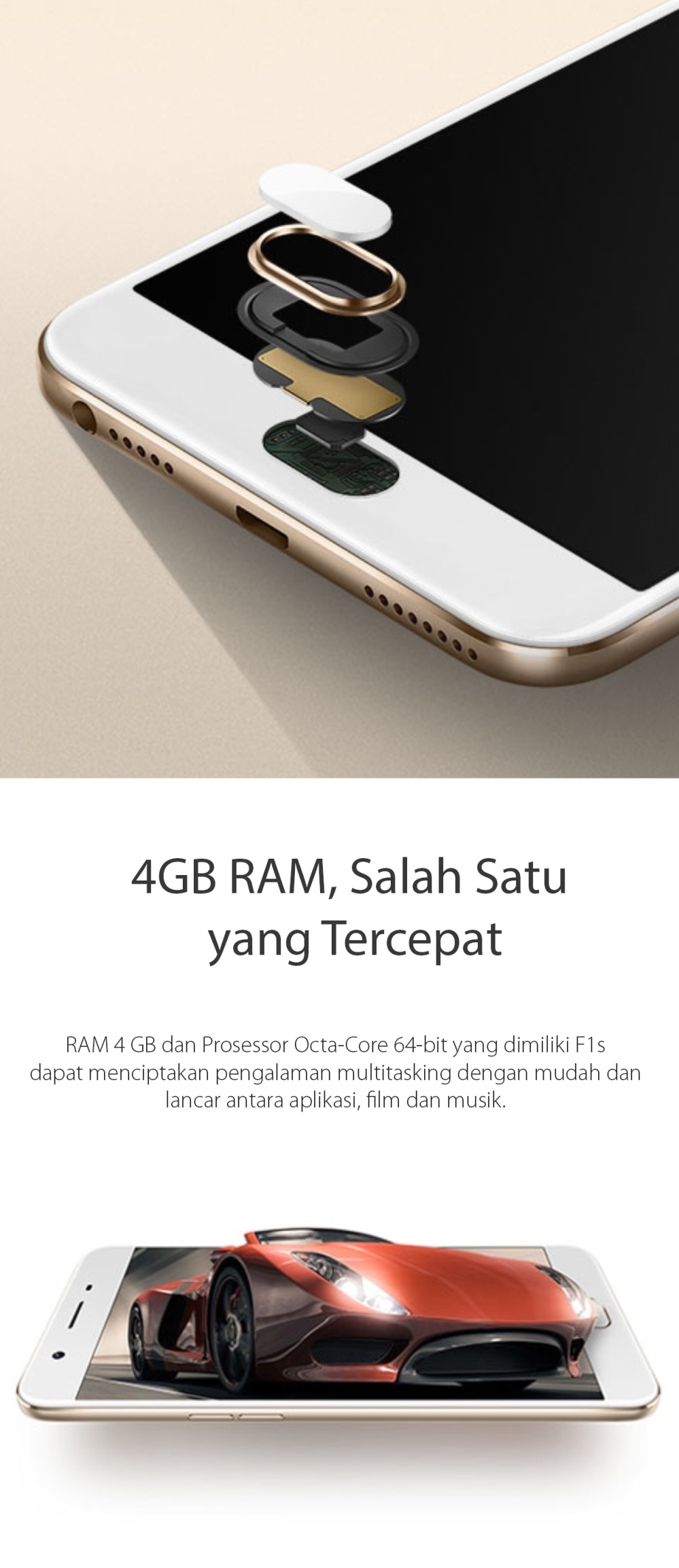 RAM 3 GB dan Prosessor Octa-Core 64-bit yang dimiliki F1s dapat menciptakan pengalaman multitasking dengan mudah dan lancar antara aplikasi, film dan musik. Berbasis Android 5.1, ColorOS 3.0 menjalankan operasi dengan responsif, mulus & performa yang efisien.
