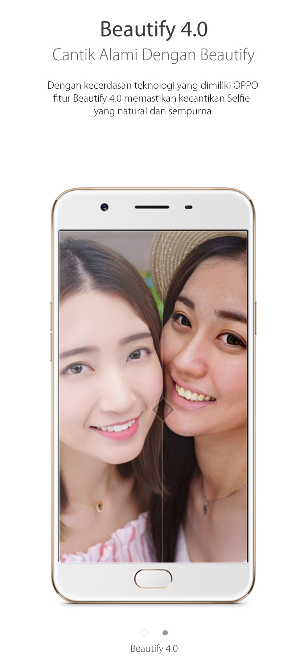 Dengan kecerdasan teknologi yang dimiliki OPPO, fitur Beautify 4.0 memastikan kecantikan selfie yang natural dan sempurna.