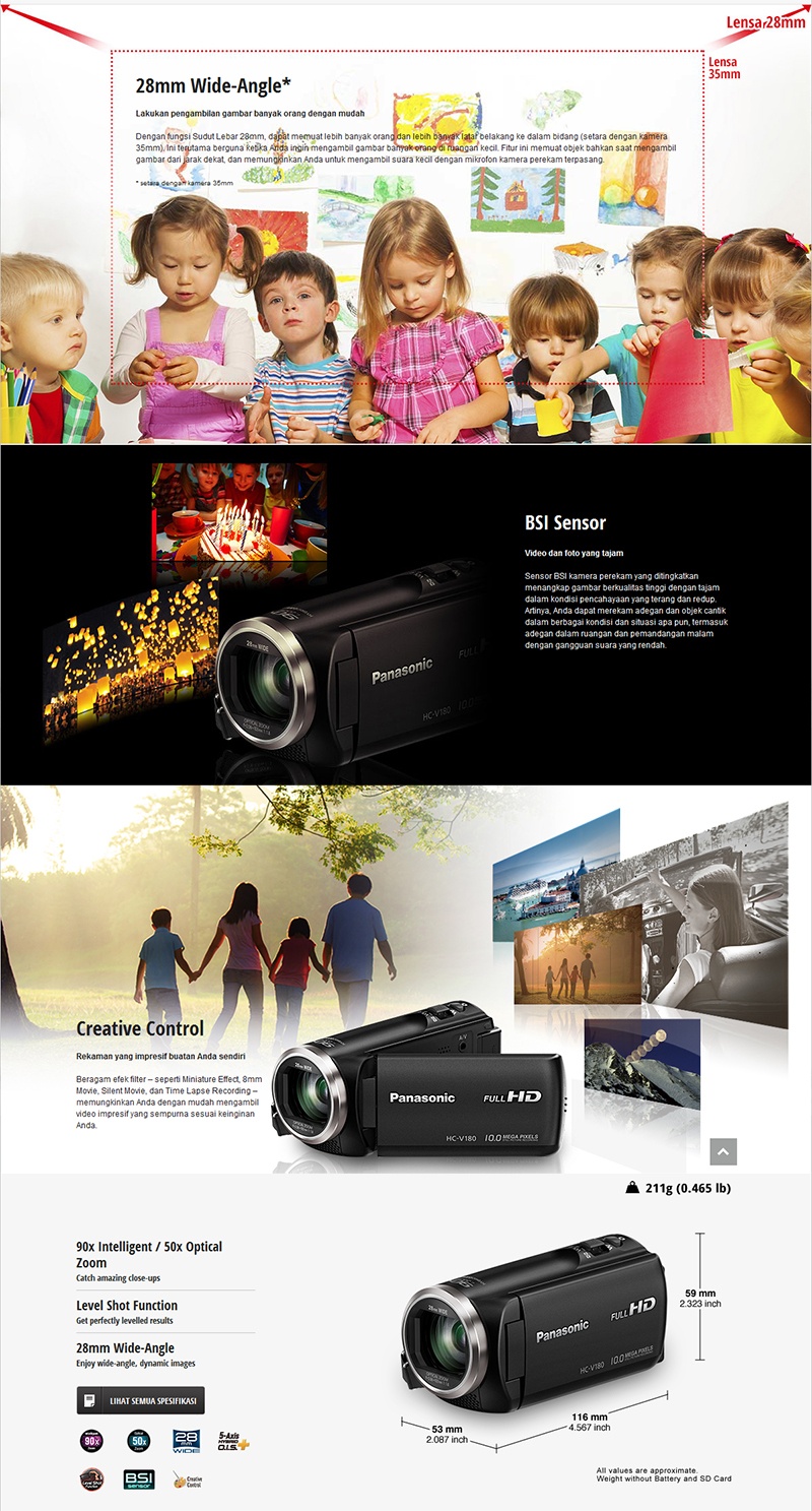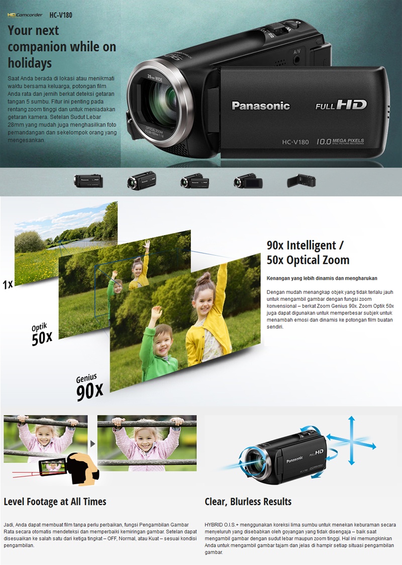 Detail produk dari PANASONIC HC-V180 Handycam 28mm WIDE 10.0MP 90x Intelligent Zoom 5 Axis HYBRID FULL HD Camcorders (GARANSI RESMI)