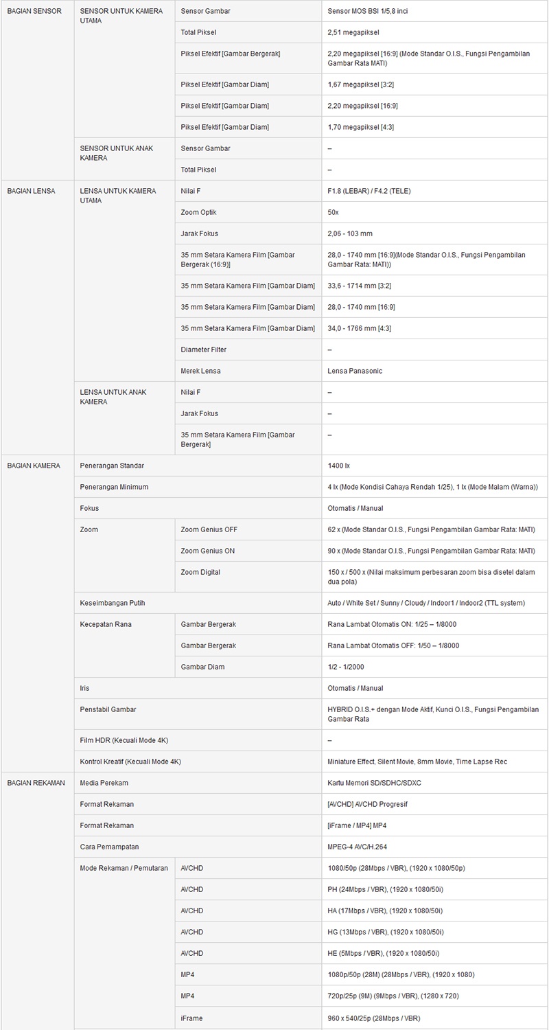 Spesifikasi PANASONIC HC-V180 Handycam 28mm WIDE 10.0MP 90x Intelligent Zoom 5 Axis HYBRID FULL HD Camcorders (GARANSI RESMI)