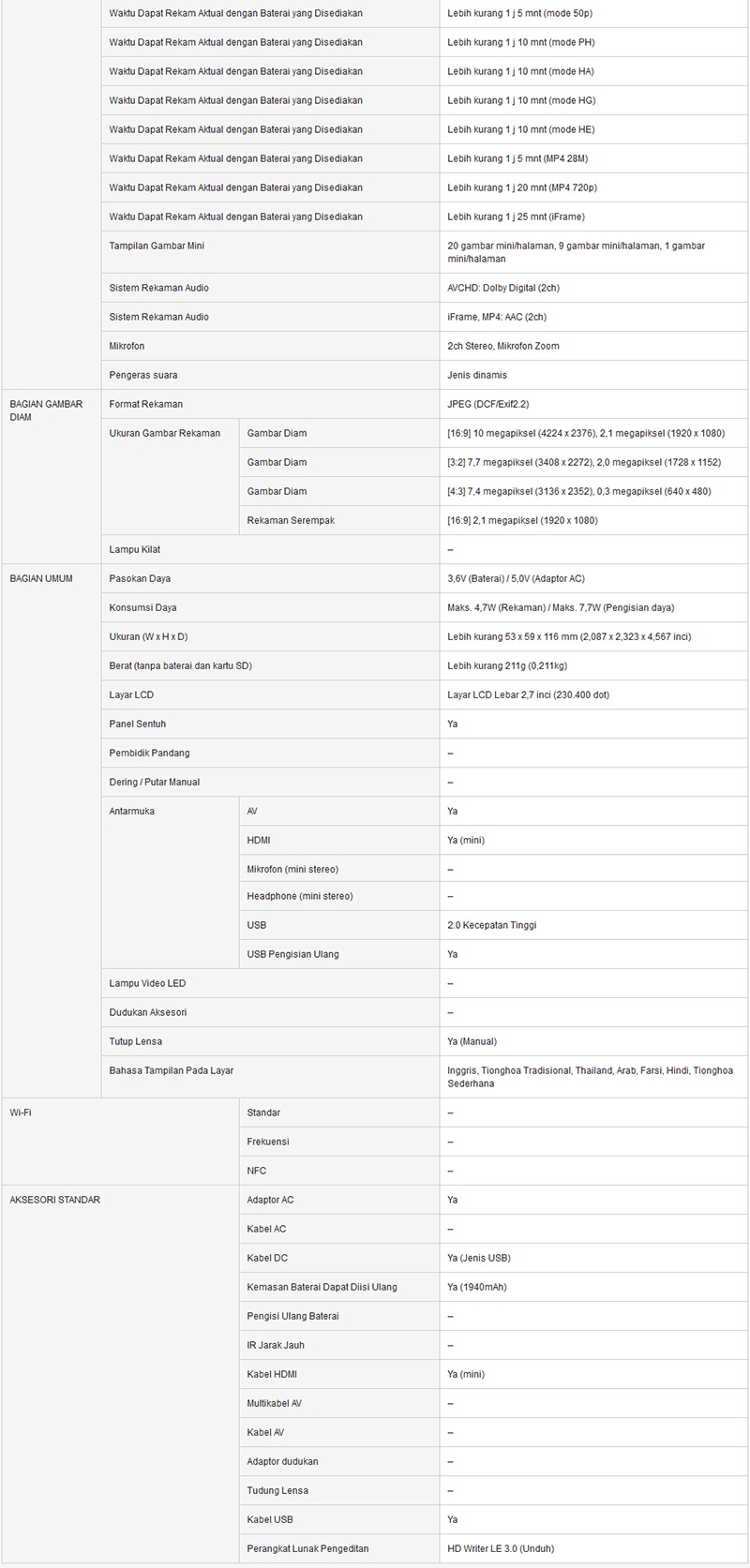 | Tipe Kartu Memori | SDHC |