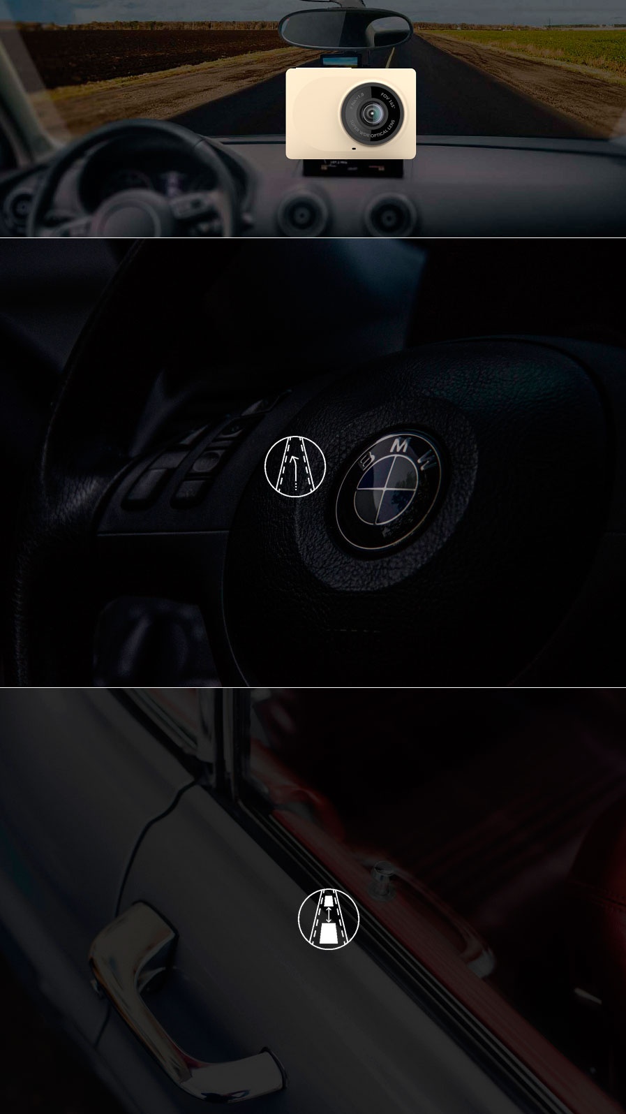 YI CAR CAM combines high standards and functions of already existing in the current market DVRs. Our goal was to maximize the performance of the device for the optimal price. Yi Car DVR has a special additional Smart feature ADAS, which analyzes the speed, distance and other data, allows to determine the hazards arising from the surrounding objects while driving, and to warn the driver about them. YI CAR CAM supports the FULL HD resolution of 1920 × 1080p 60fps and the maximum resolution of 2304 × 1296p 30fps, so you will get a high-quality 1080p 30fps video.