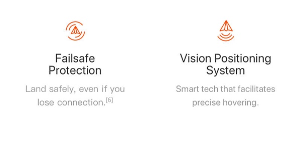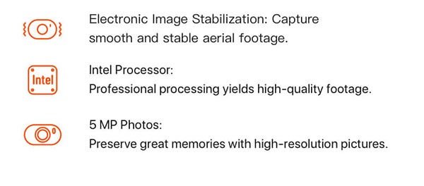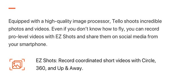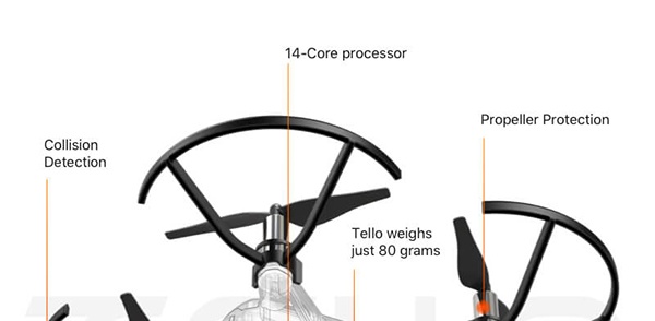 Di depan Drone Tello dilengkapi dengan kamera 5-megapixel dan mampu melakukan streaming video 720p ke smartphone Anda. Intelligent flight processor dapat mengoordinasikan gerakan kamera untuk beberapa sudut pemotretan khusus. Vision positioning system menggunakan kamera yang menghadap ke bawah untuk memastikan drone stabil saat hovering.